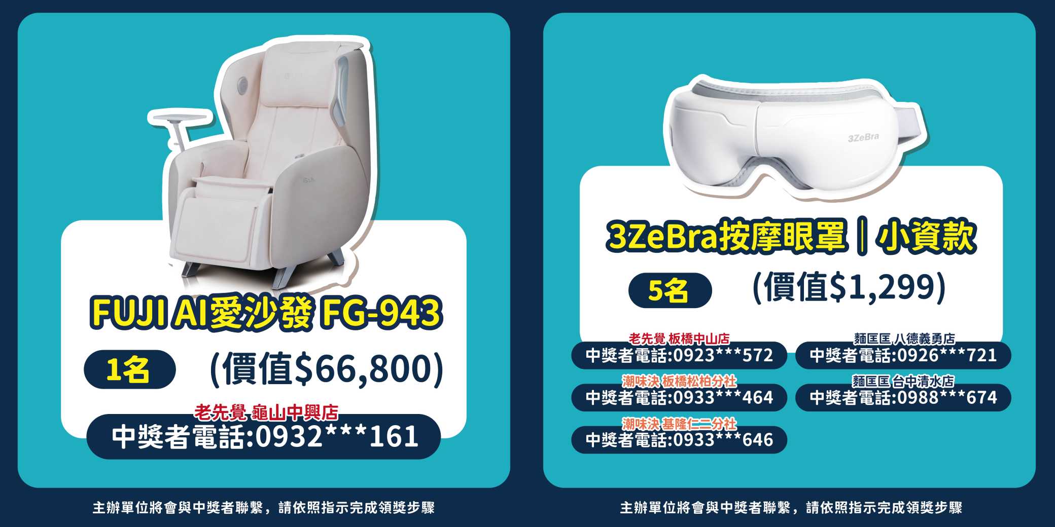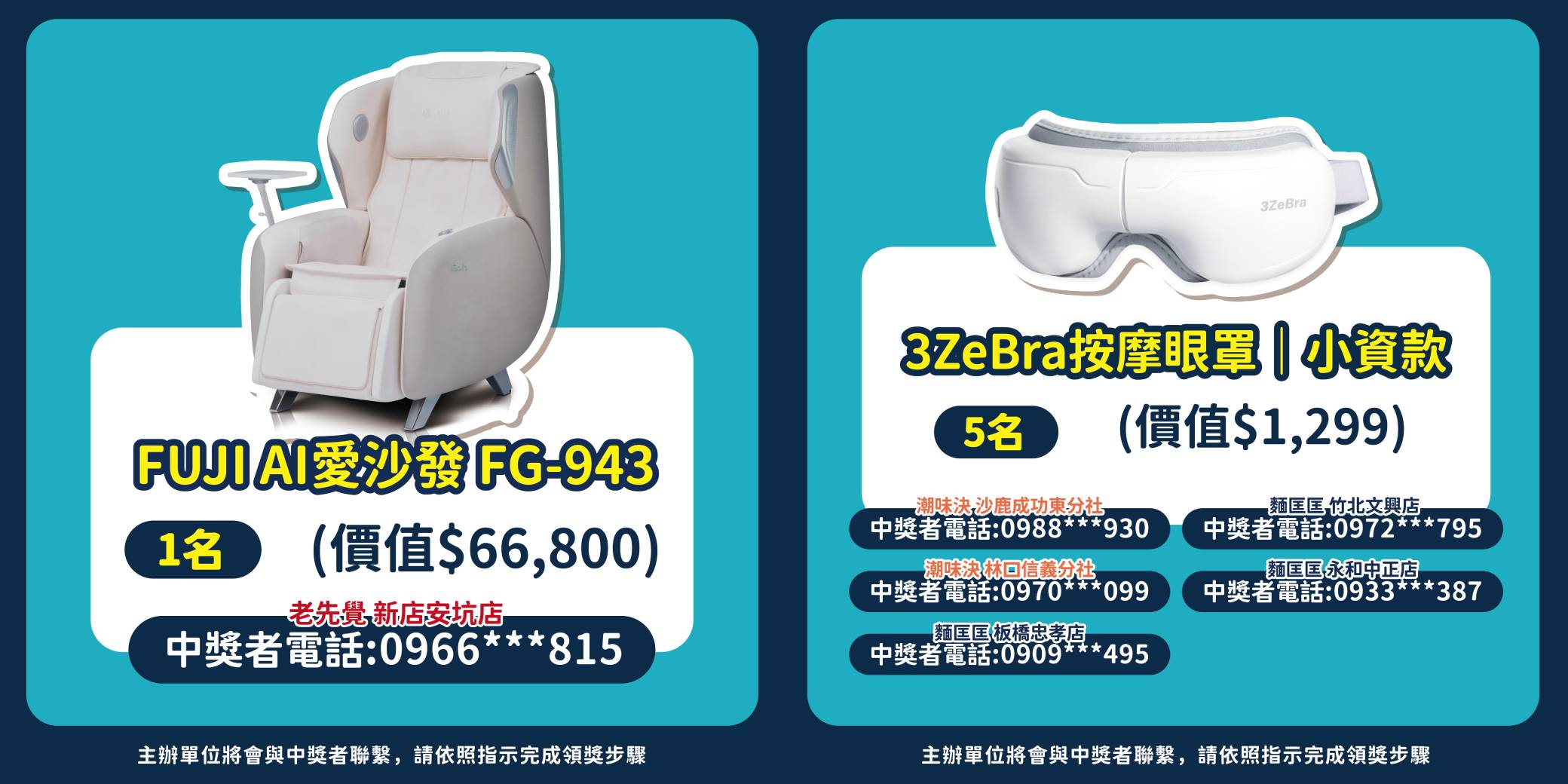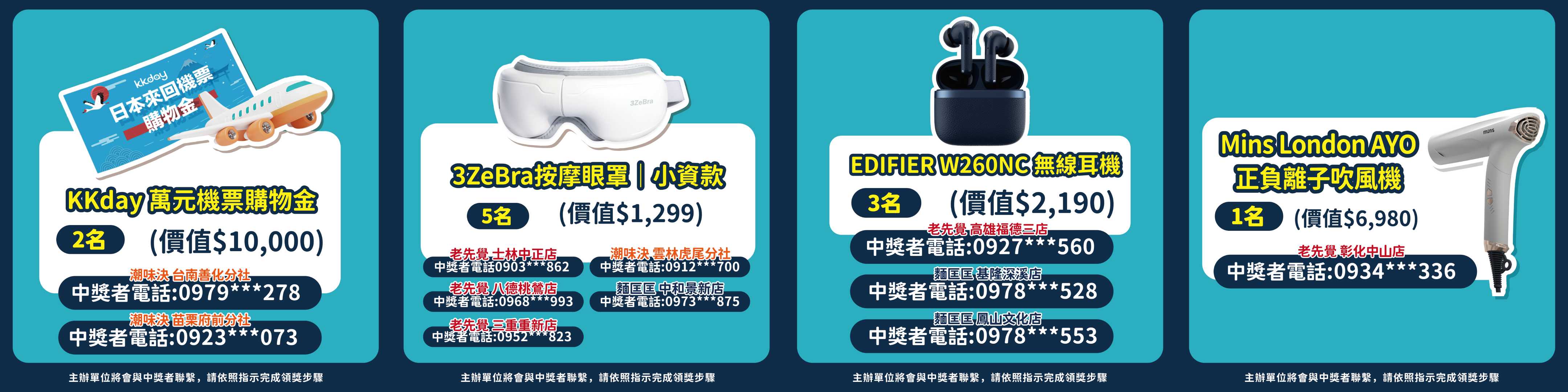 - 依據個人資料保護法,參加本活動者視為瞭解及同意抽獎活動需要進行蒐集、處理及利用個人資料(限姓名、電話等資訊),且僅為通知領獎之身份確認、聯繫,得獎者資料保存1年,開立扣繳憑單者,依稅法規定年限保存,期限屆滿或活動結束後,資料將刪除不作他用。