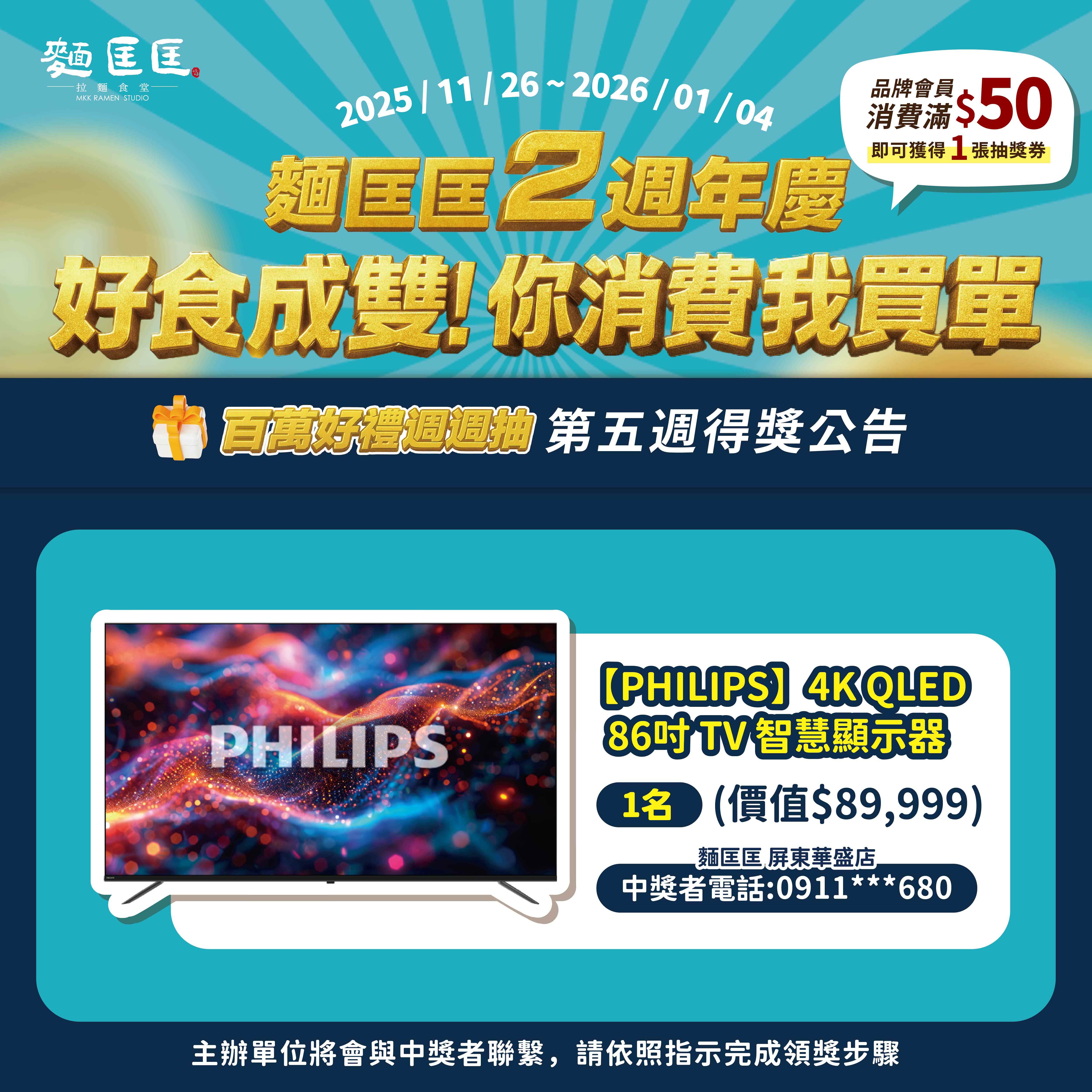 - PHILIPS 4K QLED 86吋 TV 智慧顯示器及FUJI AI愛沙發 AI按摩椅等大型獎項需由得獎者提供完整寄送資料,並由合作品牌廠商負責後續出貨與配送服務;配送時程、方式及相關細節皆以廠商實際作業規範為準。